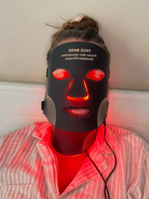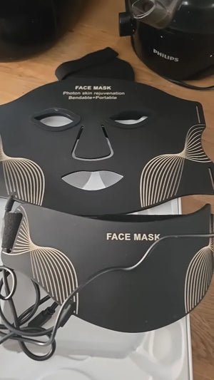 The LED mask uses light therapy to rejuvenate skin, reducing wrinkles, minimizing pores, and enhancing skin elasticity for a youthful glow.